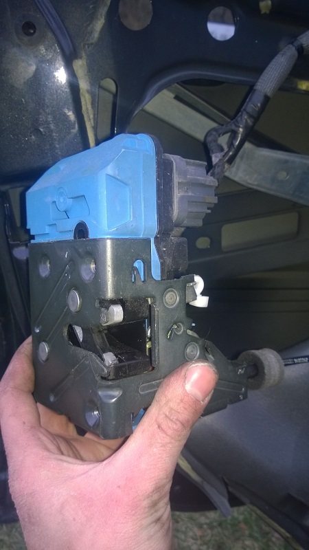 Išėmiau durų langą, išsitraukiau duru rankeną su spyna - pasirodo spyna veikia. Pabandžiau pajudint traukelę kuri yra duru spynos kuri matoma nuotraukoje