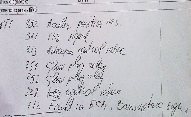 Šiandien Sostenoje pasidariau savo s40 diagnostiką. Problema, dėl kurios dariausi diagnostiką, buvo dėl dažno pakaitinimo žvakių perdegimo ir degusios skydelyje LAMBDA lemputės. Padarius diagnostiką paaiškino dėl ko gali degti lamda lemputė. Tačiau kartu davė lapą, ant kurio surašė visas klaidas. Gal kas galėtų paaiškinti visų klaidų reikšmes,būčiau labai dėkingas.